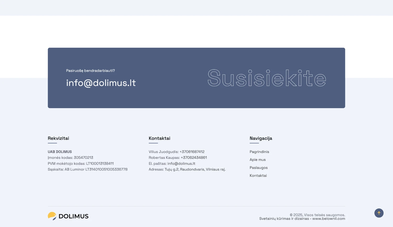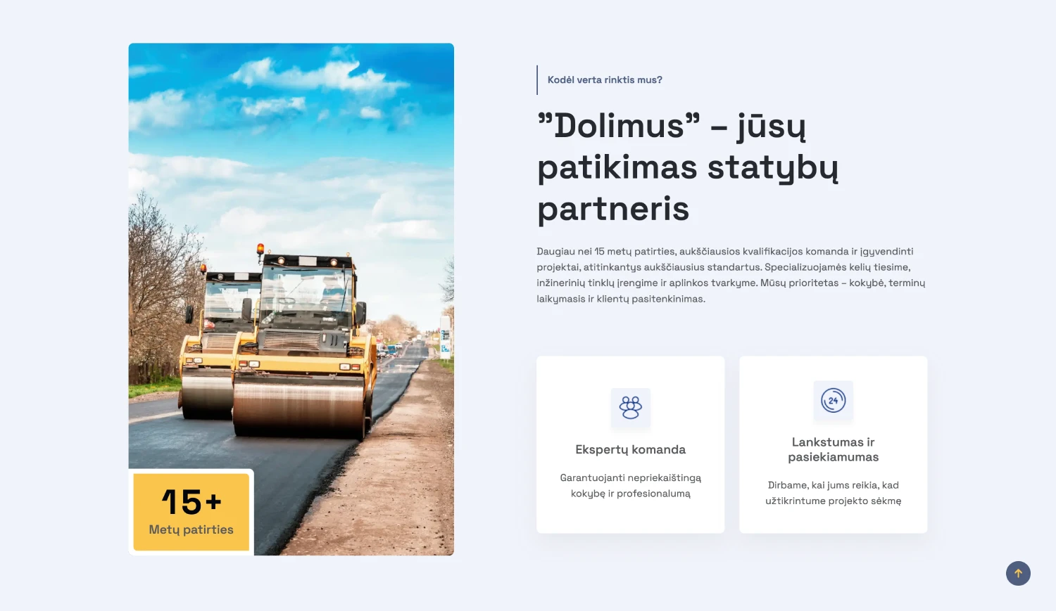 Dolimus teikia kelių ir gatvių tiesimo, inžinerinių tinklų įrengimo bei aplinkos tvarkymo paslaugas. Įmonė kreipėsi siekdama turėti paprastą, bet profesionalią skaitmeninę vizitinę kortelę, kuri parodytų jų patikimumą ir kompetenciją.