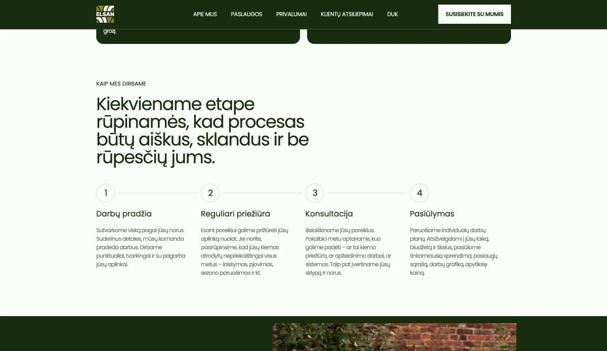 Sukūrėme vizualiai patrauklią vieno puslapio svetainę. Joje aiškiai pristatėme pagrindines paslaugas, nurodėme priežastis, kodėl verta rinktis Elsan, pateikėme nuotraukas iš sutvarkytų kiemų ir terasų. Svetainėje nuosekliai įterpti veiksmo raginimai (CTA) – mygtukai, kviečiantys susisiekti, užpildyti formą ar paskambinti. Turinys buvo subalansuotas: tik tai, kas svarbiausia, kad lankytojas neišsiblaškytų, o būtų paskatintas imtis veiksmų.
