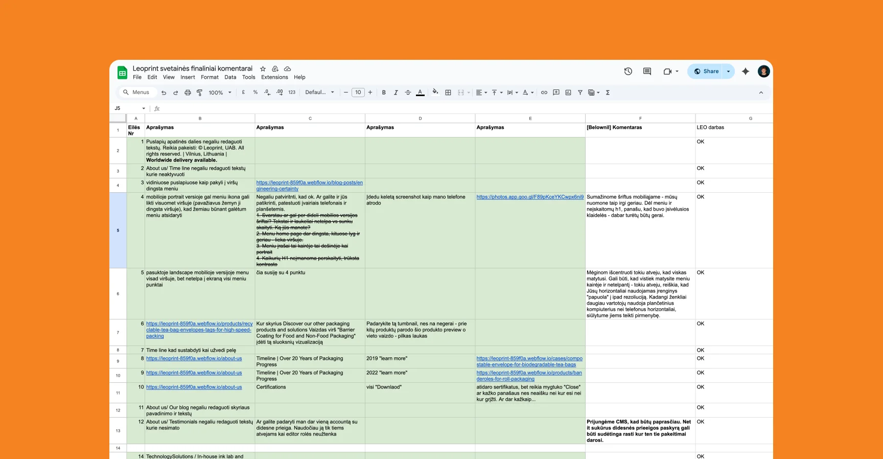 Leoprint vidaus komanda dirba su „Adobe Illustrator" – šiuo įrankiu buvo kuriami visi dizaino sprendimai. Bendradarbiavimas ir iteracijos vyko per „Google Sheets" lenteles: klientas pateikdavo pastabas, mes reaguodavome, koreguodavome ir grąžindavome kitam derinimo ratui. Toks darbo modelis leido klientui išlaikyti visišką kontrolę virš vizualinio rezultato, o mums – sutelkti dėmesį ties tuo, kur galėjome tikrai pridėti vertės: kokybiškame techniniame įgyvendinime ir SEO.