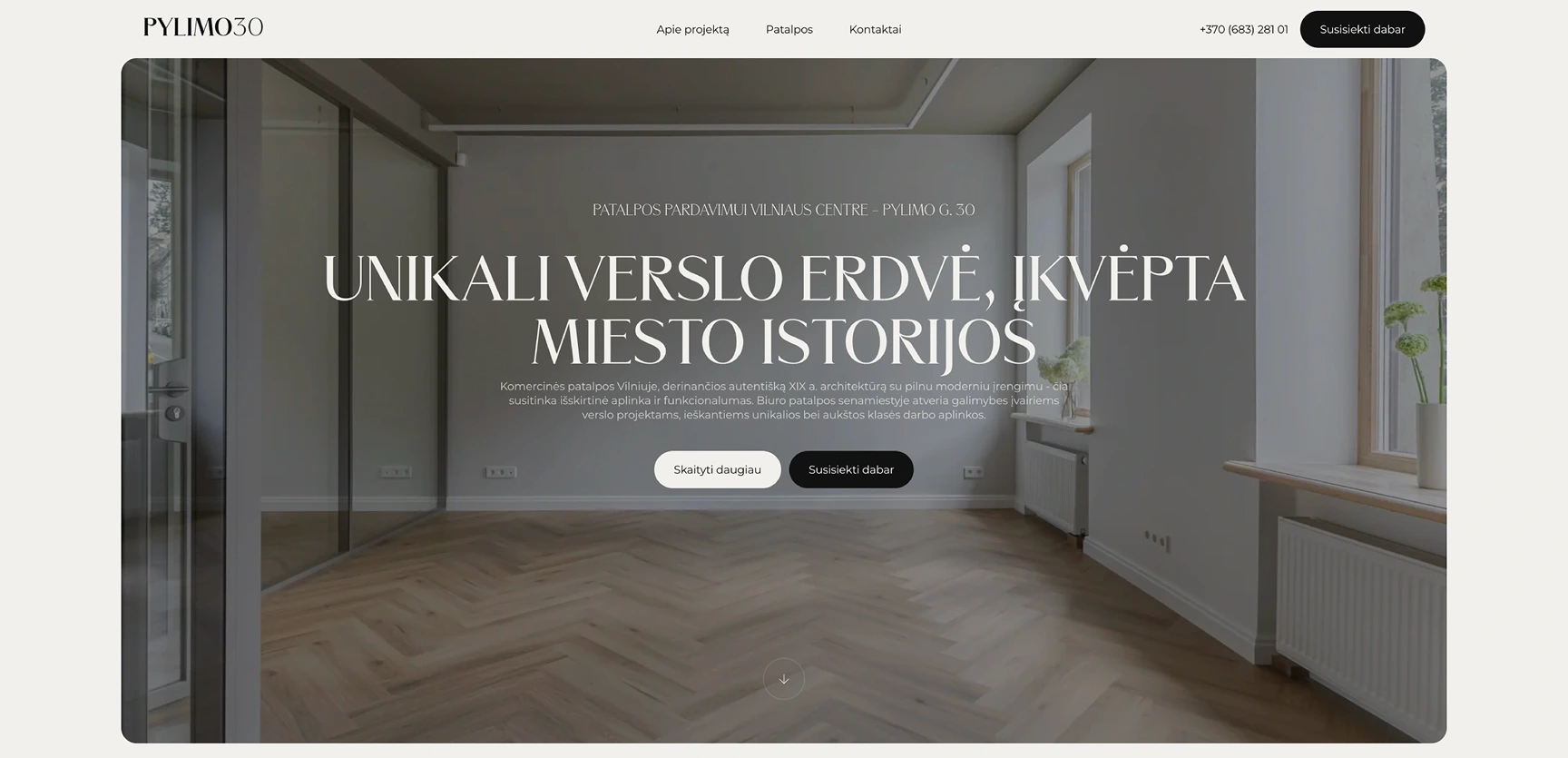 Pylimo 30 – komercinės patalpos parduodamos Vilniaus senamiestyje, XIX a. pastate, kuriame autentiška istorinė aplinka derinama su moderniu įrengimu. Projektas ieškojo skaitmeninio veido, kuris tiksliai perteiktų šią pusiausvyrą: ne tik informuotų apie patalpas, bet ir sukurtų jausmą, kad čia – kažkas išskirtinio. Vieno puslapio svetainė turėjo tapti ne sausu katalogu, o patirtimi.